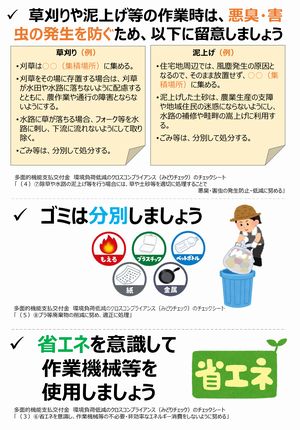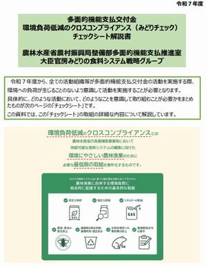 令和7年度から、多面的機能支払の全ての活動組織において、各種活動の実施に際して環境負荷が生じることがないよう意識して活動する「環境負荷低減のクロスコンプライアンス」の制度が位置付けられました。